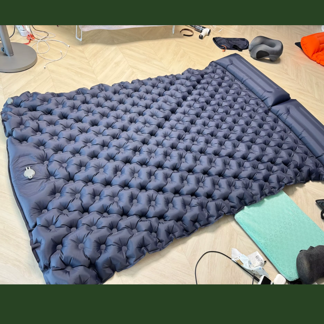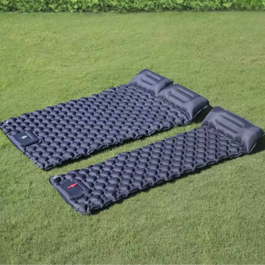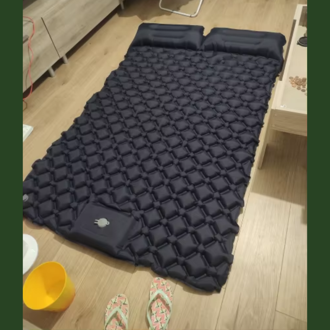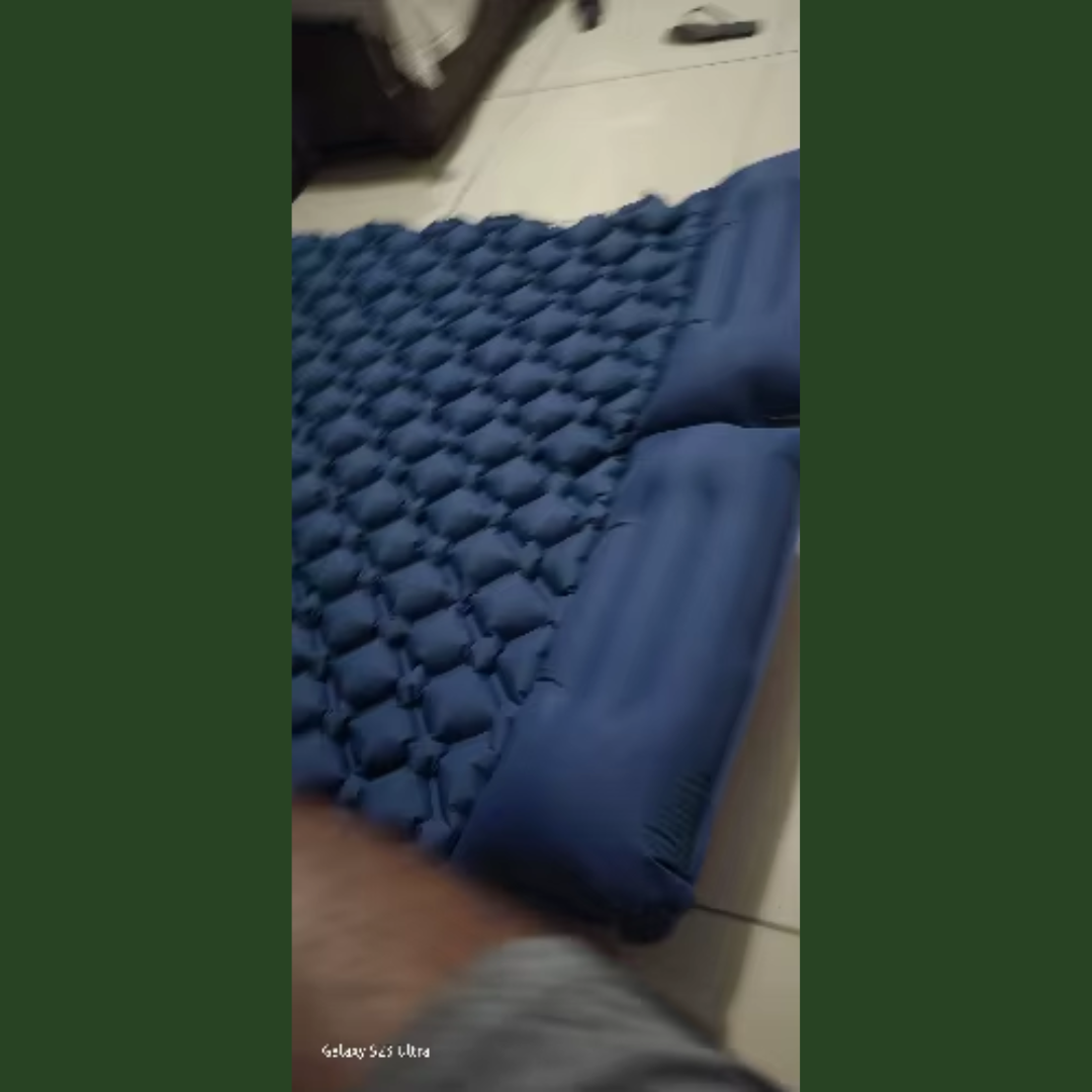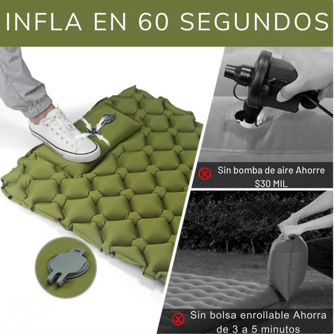 Desenrolla la alfombrilla, presiona la bomba de pie incorporada para inflarla, ajusta la firmeza, luego abre la válvula para desinflar y compacta hasta el tamaño de la Bolsa.